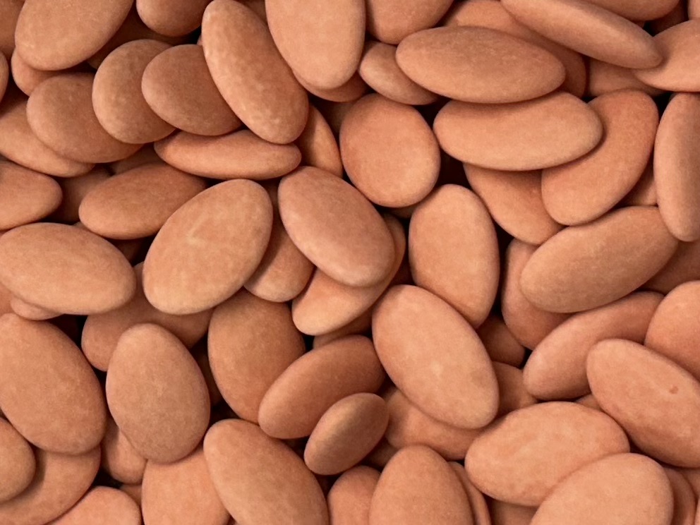 Intérieur chocolat forme amande dragéifiée au sucre.
