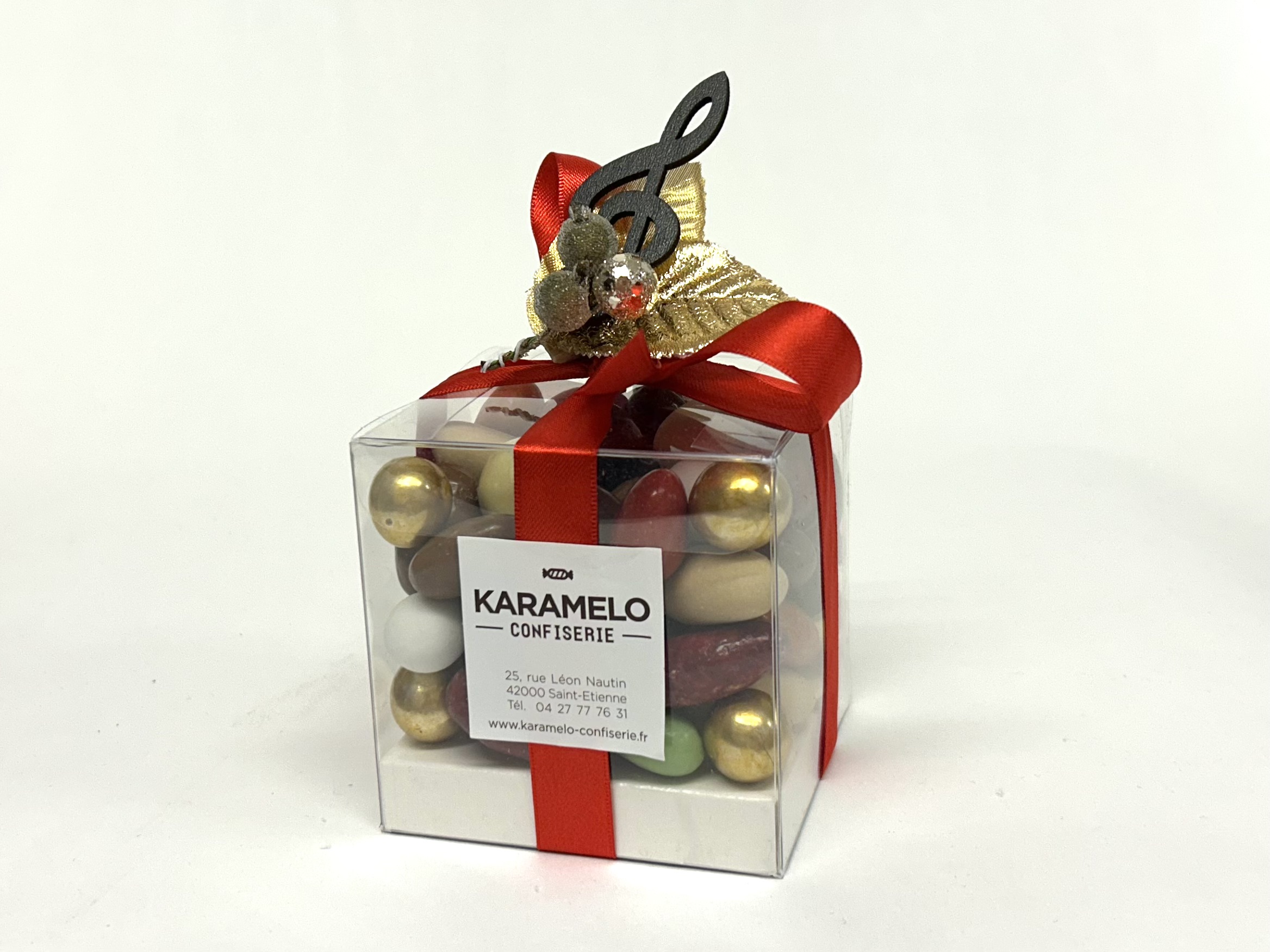 Noisette chocolat or : Chocolat noir (42%), pâte de cacao, sucre, beurre de cacao, émulsifiant : lécithine (SOJA)), Sucre (32%), NOISETTE (25%), épaississant : gomme arabique, amidon de riz, gélatine de poisson, arôme naturel de vanille avec autres arômes naturels, colorants : argent, norbixine de rocou, agents d’enrobage : gomme laque.