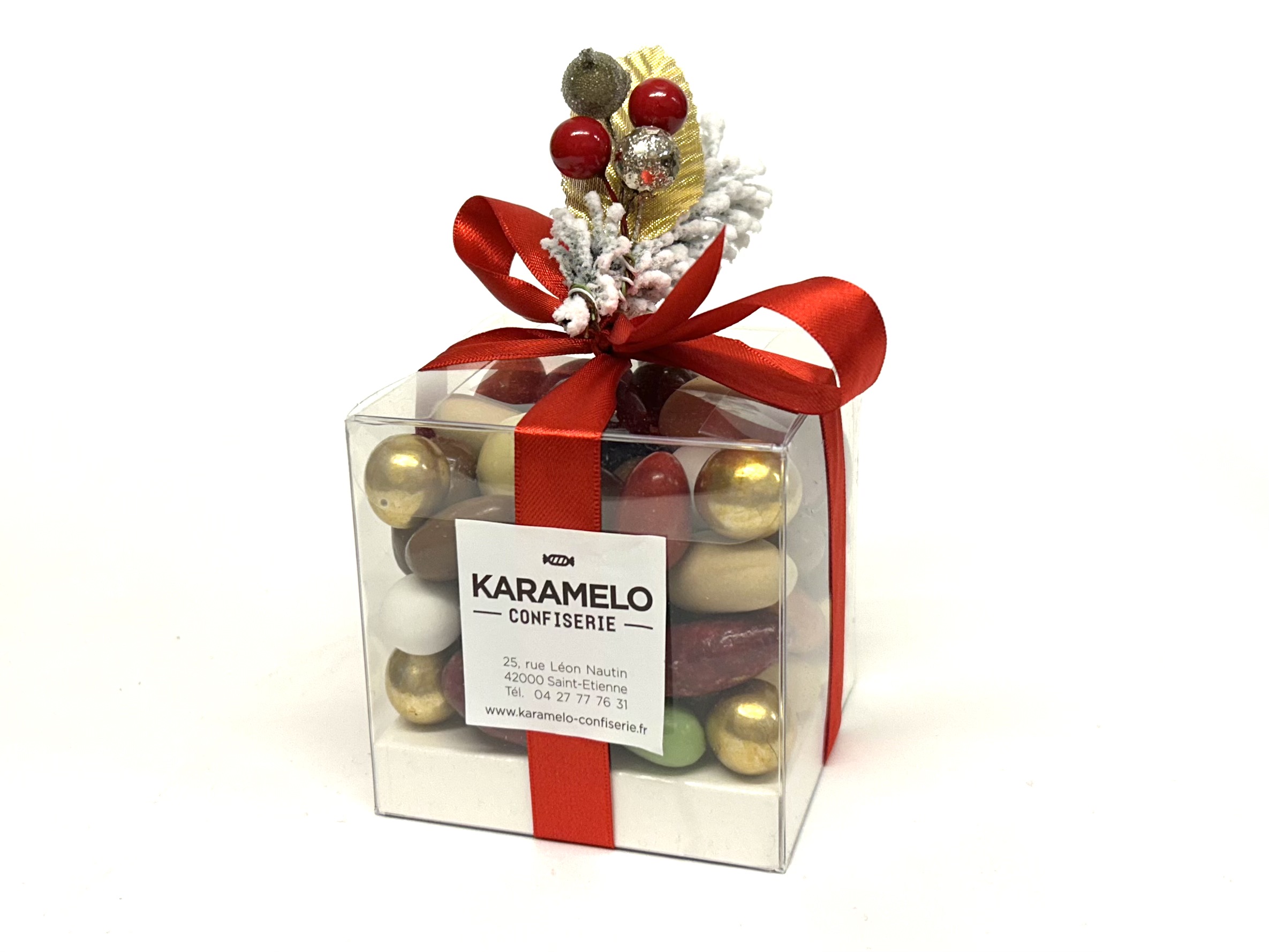 Perle de mandarine : chocolat blanc 43,6% (sucre, beurre de cacao, poudre de LAIT écrémé, matière grasse LAITIERE, émulsifiant : lécithine [SOJA], arôme naturel de vanille), pâte de fruit saveur mandarine 27,6% (sucre, pulpes de fruits 9% (abricot 7%, mandarine 2%), sirop de glucose, gélifiant : pectine, acidifiant : acide citrique, arôme naturel de mandarine), chocolat noir d’origine Equateur à 71% de cacao 27% (pâte de cacao Equateur, sucre, beurre de cacao, arôme naturel de vanille), agents d’enrobage : gomme d’acacia et gomme laque, sucre, ingrédients colorants : jus de betterave; paprika, sirop de glucose.