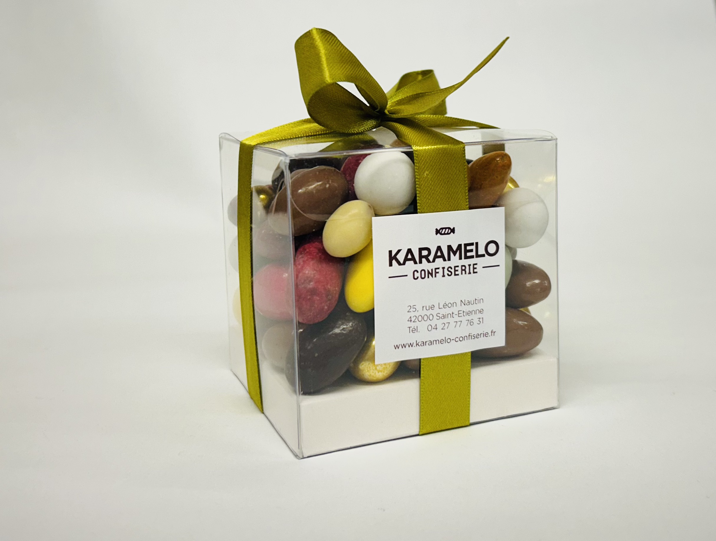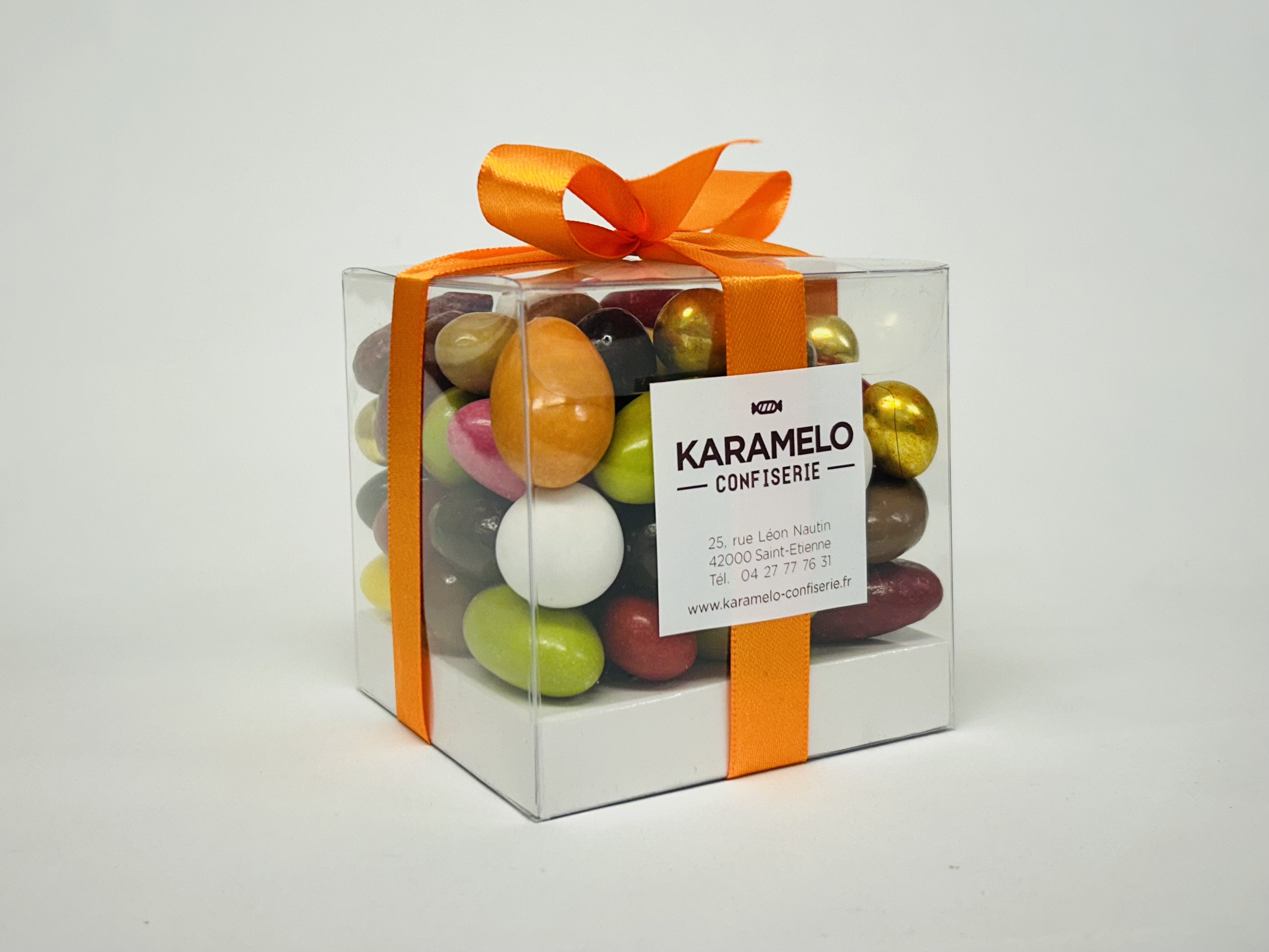 Amande lait : Chocolat lait (68,3%), sucre, beurre de cacao, poudre de LAIT entier, pâte de cacao, LACTOSERUM en poudre, émulsifiant : lécithine (SOJA)), arôme naturel de vanille, Amande (30,7%), arôme naturel de vanille avec autres arômes naturels, agents d’enrobage : gomme arabique, gomme laque.