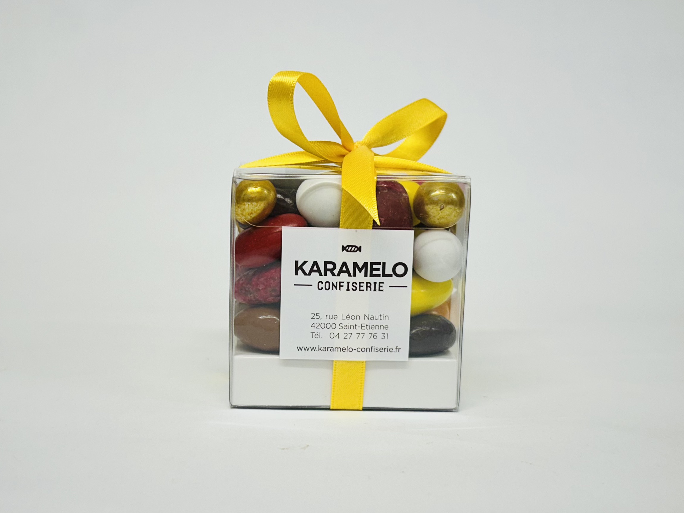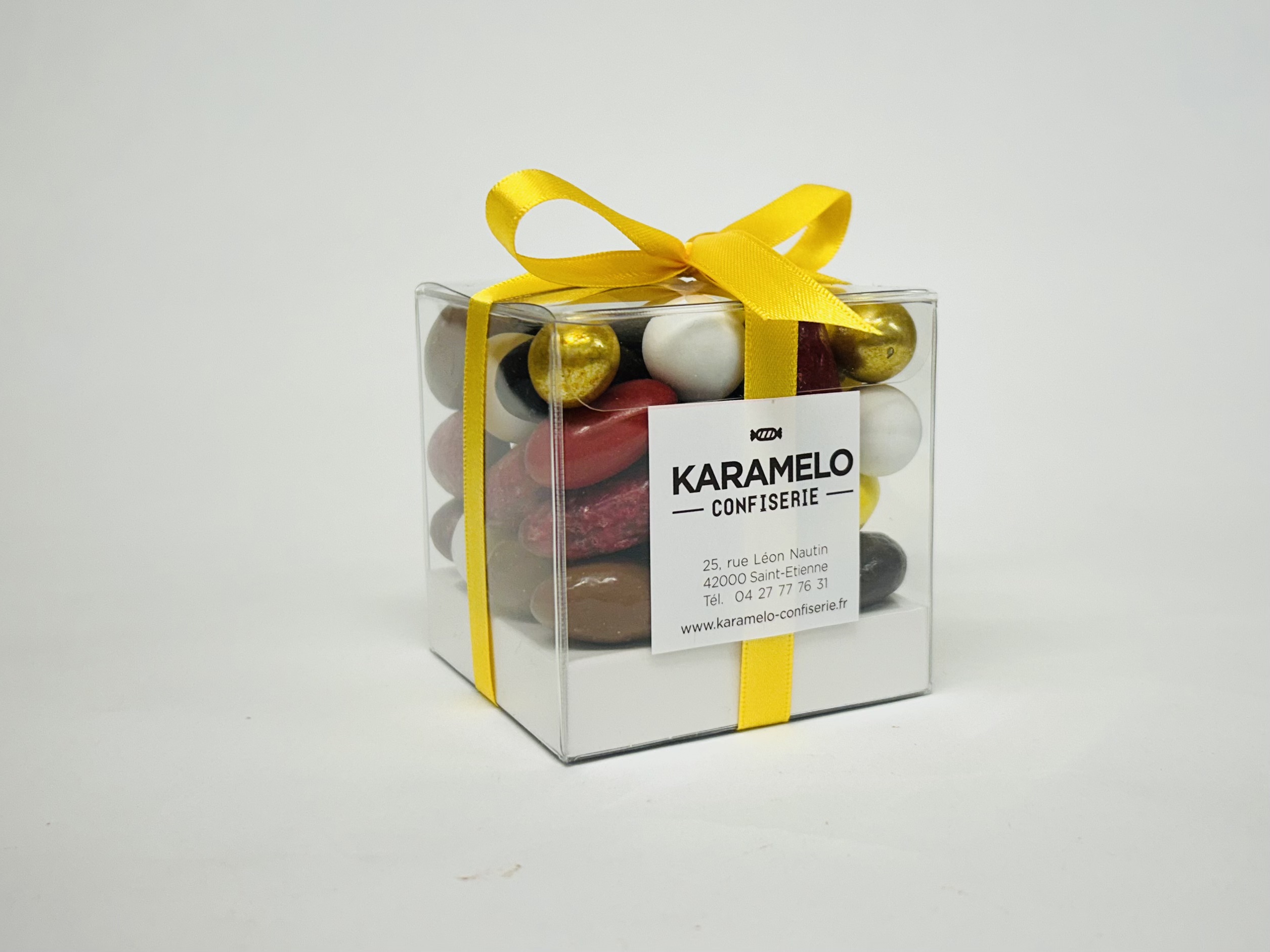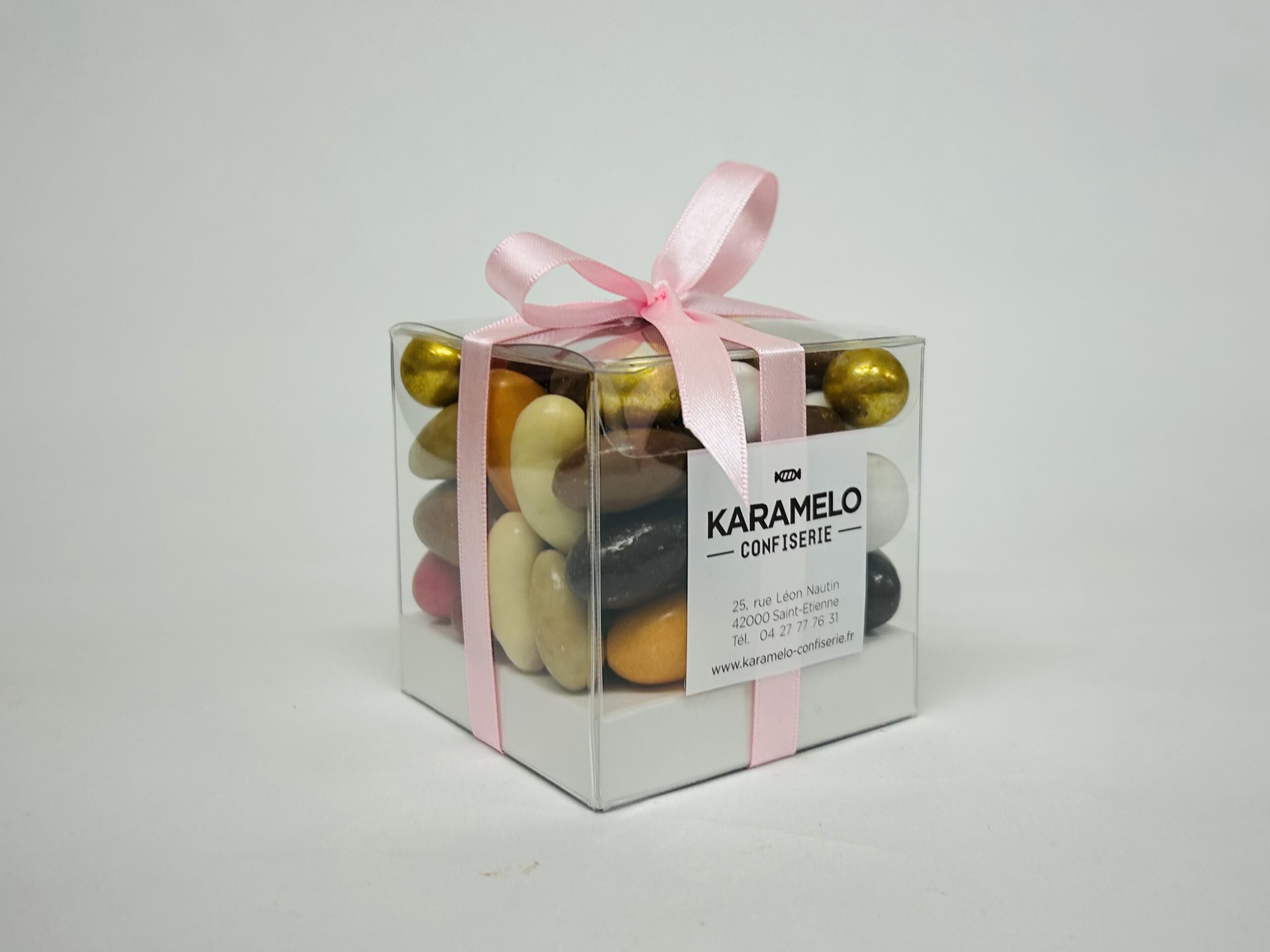 Amande lait : Chocolat lait (68,3%), sucre, beurre de cacao, poudre de LAIT entier, pâte de cacao, LACTOSERUM en poudre, émulsifiant : lécithine (SOJA)), arôme naturel de vanille, Amande (30,7%), arôme naturel de vanille avec autres arômes naturels, agents d’enrobage : gomme arabique, gomme laque.