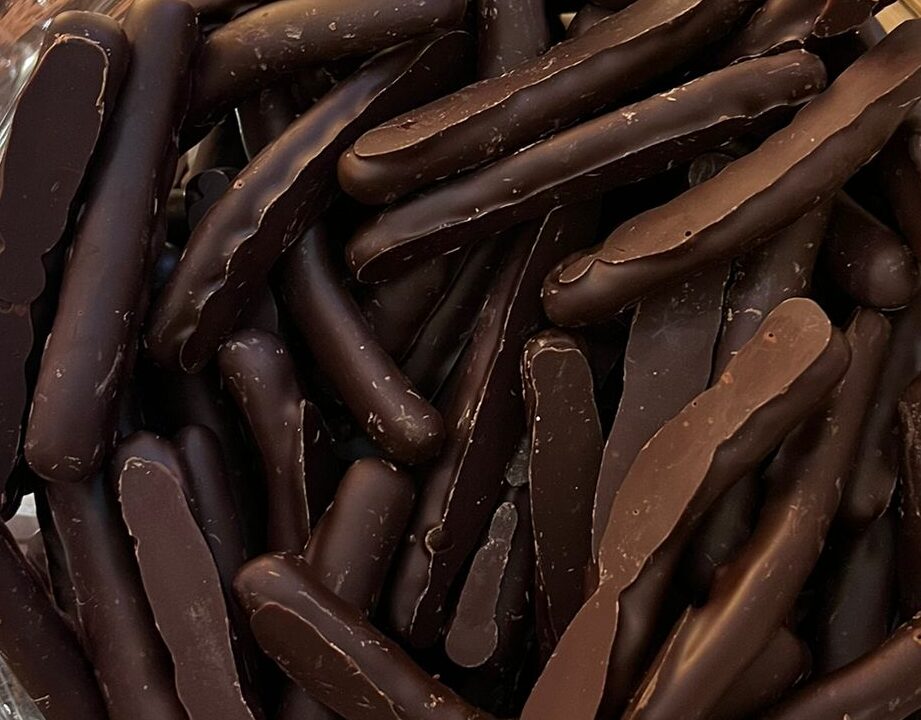 Laissez-vous séduire par nos orangettes : des écorces d’orange confites enrobées de chocolat pour un mariage intense et fruité.