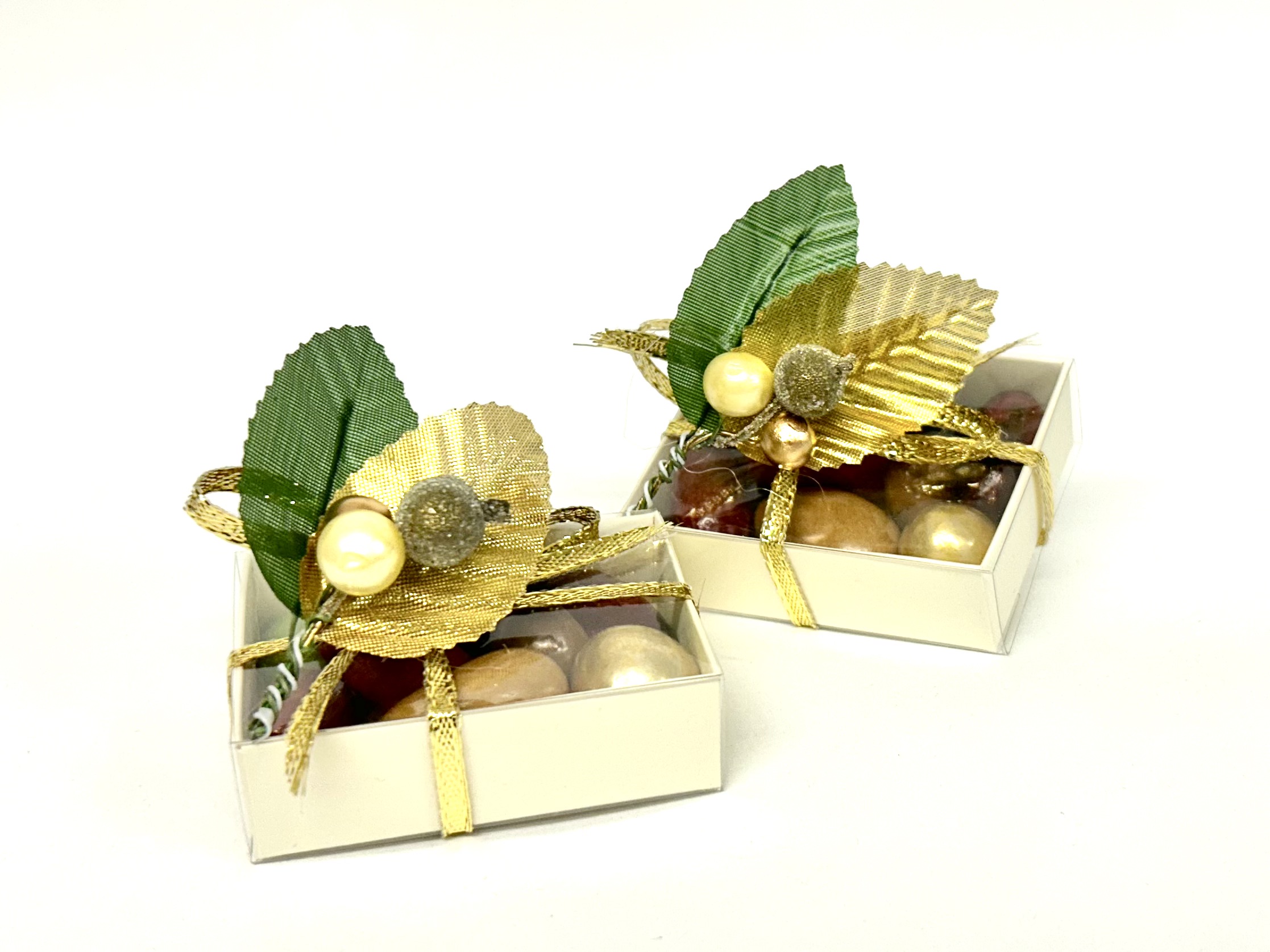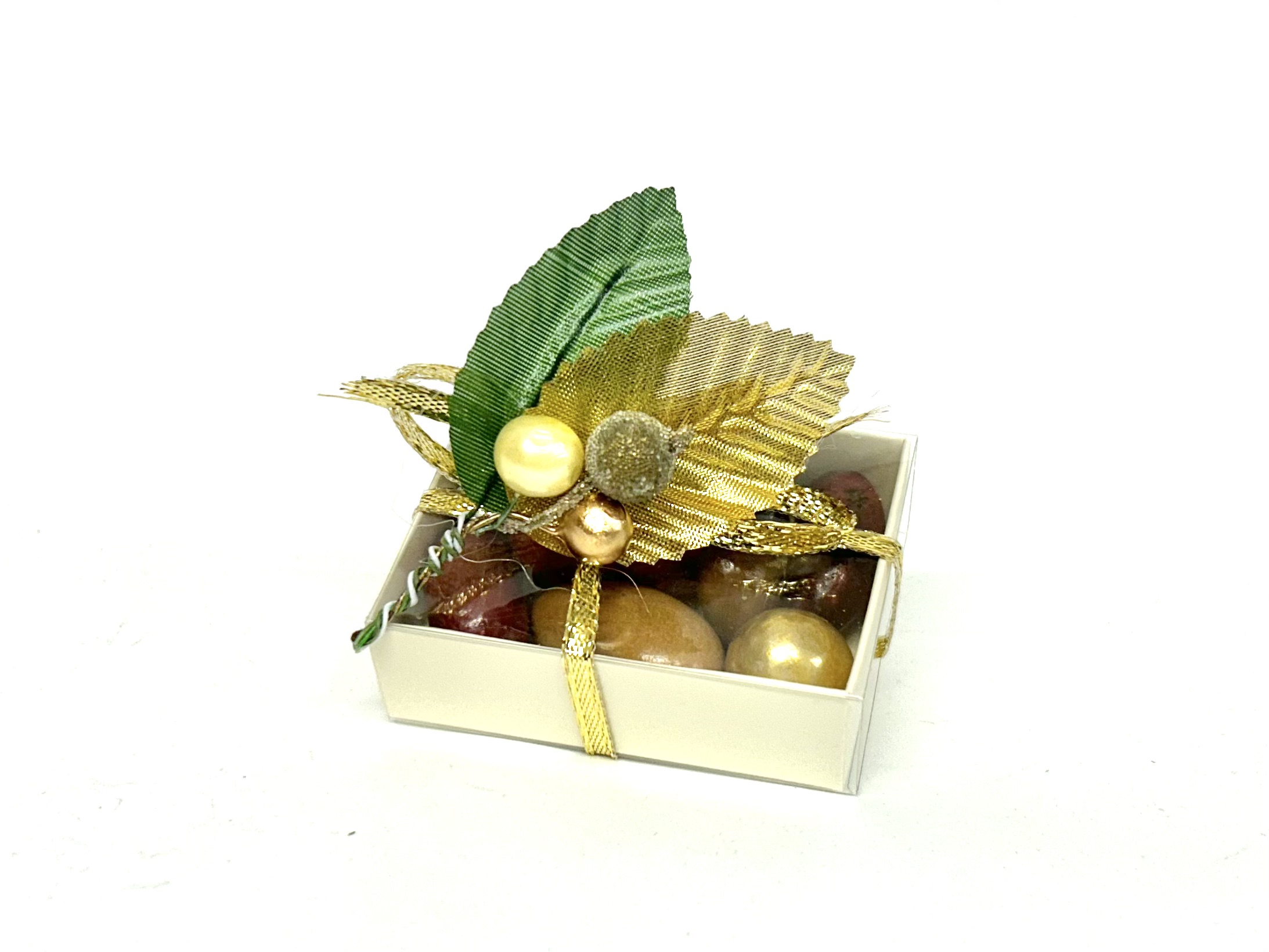 Noisette or : noisette grillée enrobée de chocolat noir, de sucre, argentée puis colorée